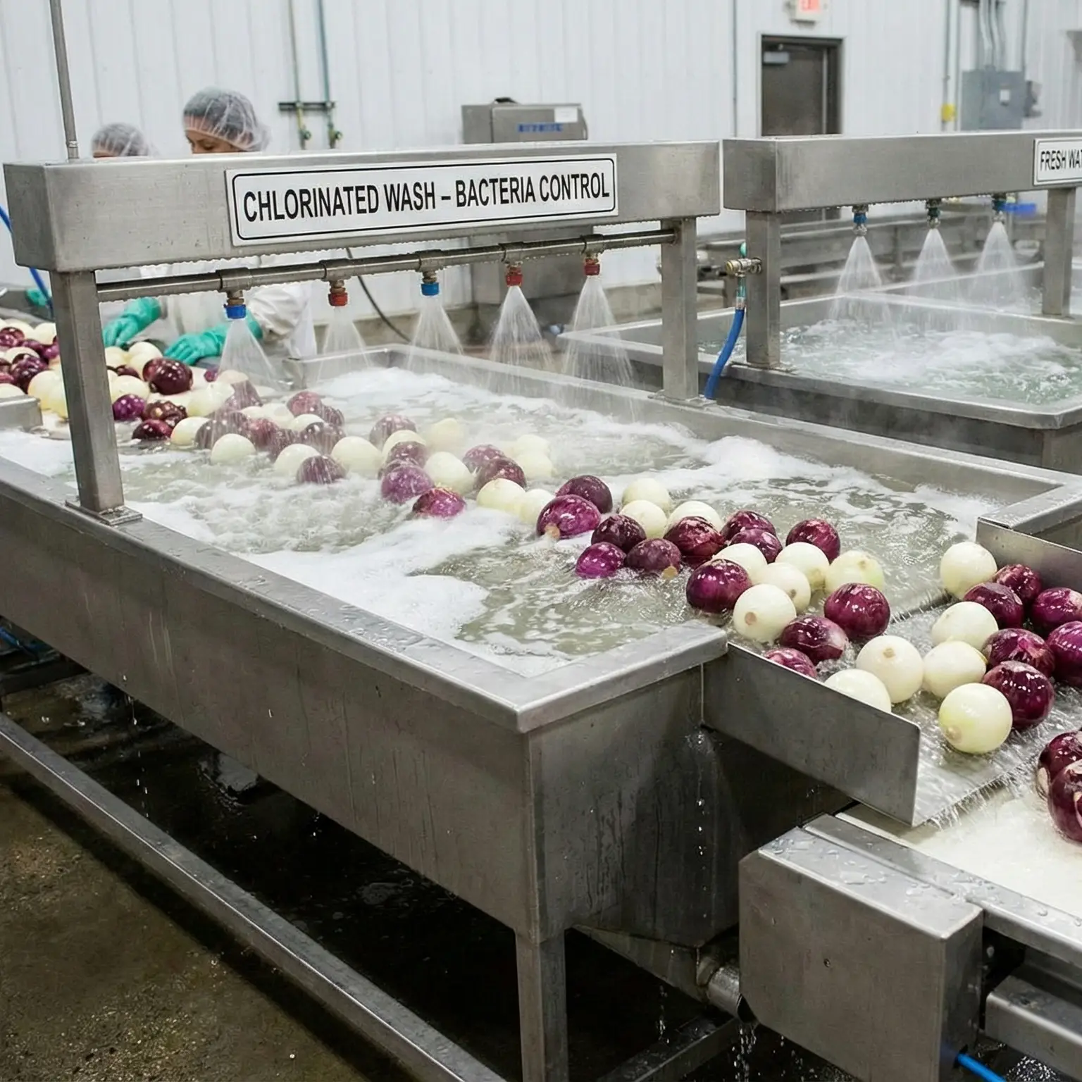 This is the “wet” zone. Raw onions come in with soil, roots, and skin. We need to strip that away without damaging the flesh inside.
